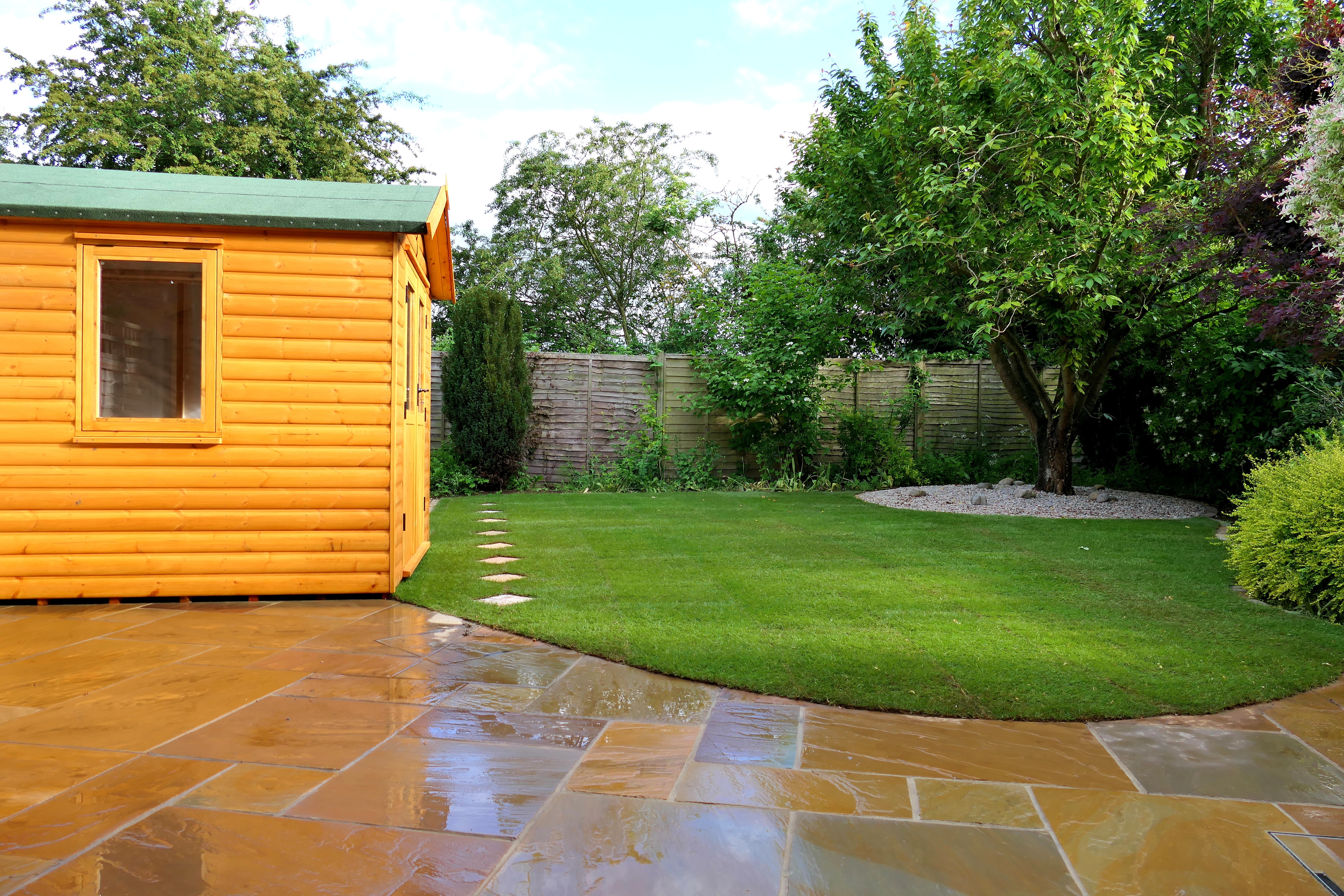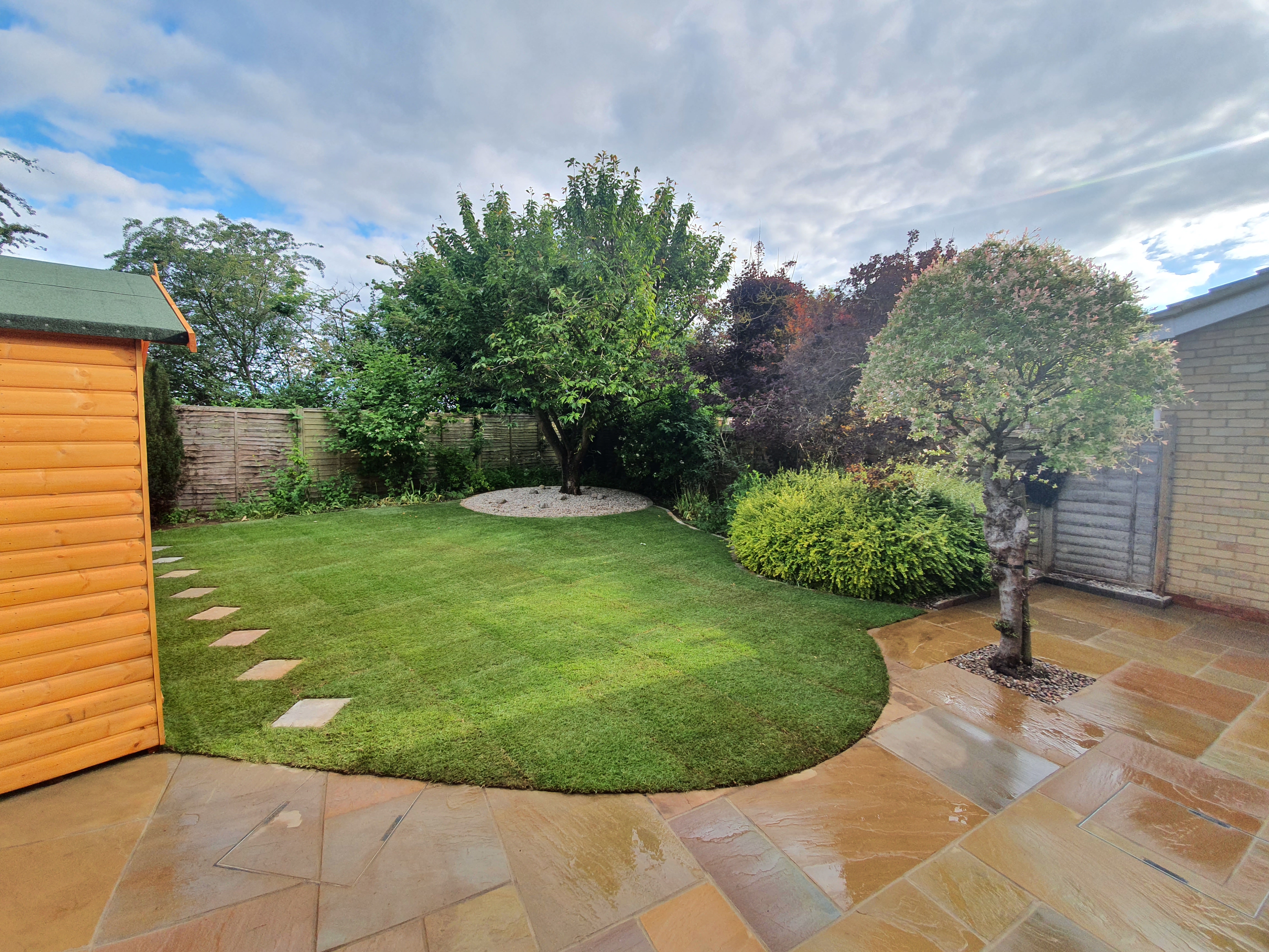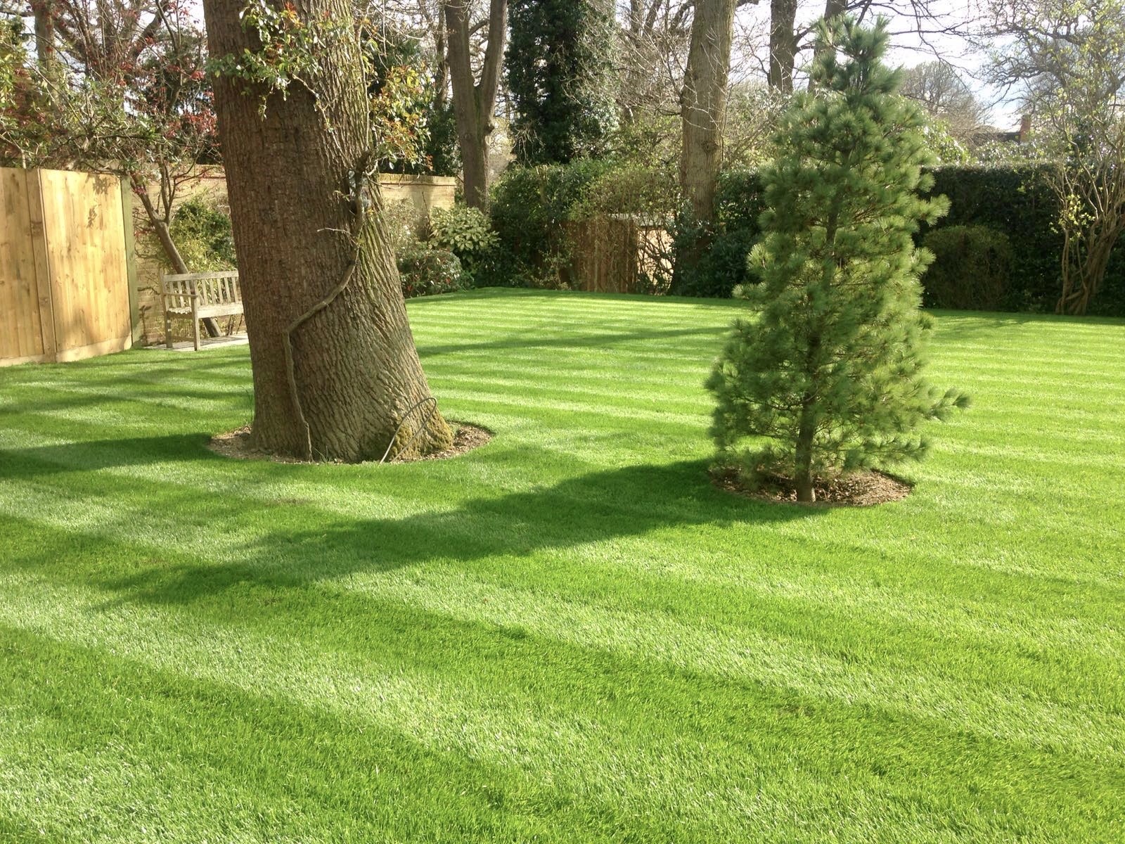 Many different sizes and shape of lawns laid, expertly cut around stepping stones and garden features.